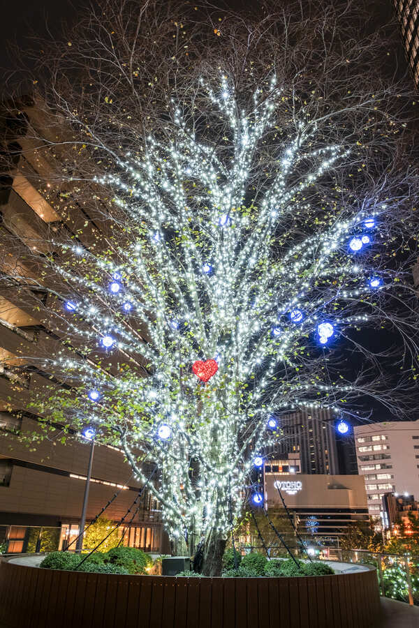 大階段上には、今年から登場した「ETERNAL HEART TREE」が展開中。白銀に輝くイルミネーションをまとったカツラの木に、赤いハートのオーナメントをひとつだけ飾り、花言葉「不変」にちなみ“永遠の心の木”として表現しています。