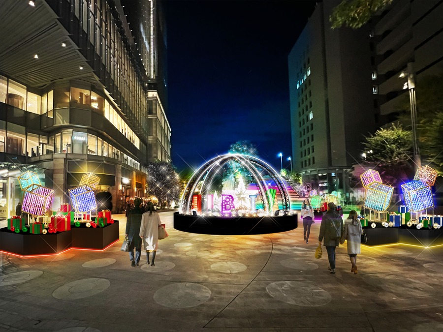 「Star of Winter Romance」は、「星が最も輝く真冬の夜」をイメージしたイルミネーション演出です。ステップ広場中央には、大きな星型のイルミネーションオブジェが設置され、その白い輝きが希望のシンボルとして訪れる人々を温かく迎えます。広場内に設置されているTwinklyイルミネーション・キューブは、ピンク系など淡い暖色系をベースに、白や青、黄色などをアクセントにした「上質な色彩」で空間を彩ります。これにより、まるでプレゼントを贈る瞬間のような心躍る華やかさを演出。一緒に置かれているギフトボックスと相まって、恋人や家族、大切な人との温かいひとときを楽しめるロマンティックな空間が広がります。また、大階段のイルミネーションとも連動し、冬の夜を背景にしたフォトスポットとしてもお楽しみいただけます。