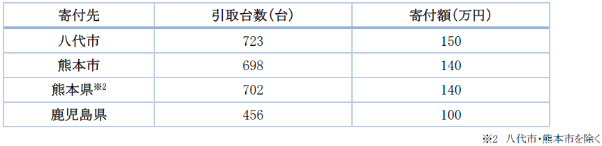 義援金の贈呈式は、12月3日に八代市役所、12月8日に熊本市役所、12月11日に熊本県庁、12月12日に鹿児島県庁にて、それぞれ執り行いました。寄付金額は、水害により発生した損害車1台あたり2,000円とし、熊本県および鹿児島県の2県において、合計約2,650台の水害車両を引き取らせていただいたことから、寄付総額は約530万円となりました。