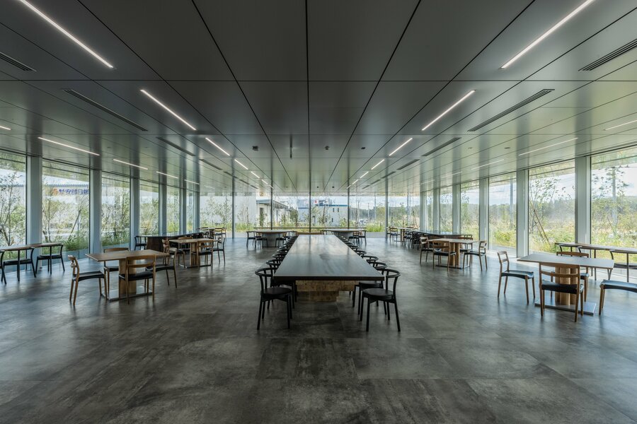 工業団地という景観の手がかりが少ない環境の中で、「風景に溶け込む建築」を目指した本計画は、社員食堂という日常的な場に新しい価値をもたらそうとする意欲的な試みである。造成前の原風景を手がかりに森を再生し、アプローチから建物周囲まで連続的な緑の体験をつくり出した点は、工業団地の単調な風景に一石を投じる提案といえる。食堂内部は四面ガラスの開放的な構成とステンレス製軒天への風景の映り込みにより、自然を身近に感じられる心地よい空間を実現している。社員の昼休みを豊かにし、雇用の面でも魅力につながる環境整備として、企業姿勢を体現する建築である。
