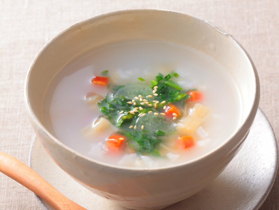 やさしい味わいの粥に七草を加え、干し貝柱やオイスターソースを使った旨みのあるたれでおいしさプラス。年末からお正月にかけてのご馳走で疲れた胃腸におすすめです。