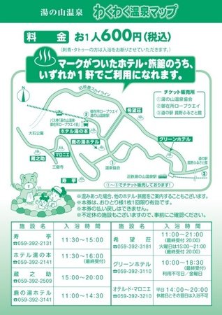 「わくわく温泉チケット」は、湯の山温泉郷にある7つの宿泊施設のうち、いずれか1施設で利用できる日帰り入浴券です。料金は1枚600円(税込み)と気軽に名湯を楽しめる価格となっています。