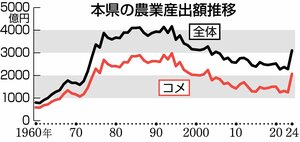 24年産米を巡っては、23年産米から続くコメ不足で価格が上昇した上、県内の収穫量も前年より約3万トン増えたことから産出額を押し上げた。農業産出額に占めるコメの割合は66・7%と前年の55・0%から上がった。県農産園芸課は「全国の販売業者や消費者に新潟米を評価していただけた。コメ全体の消費拡大と生産者の所得最大化に向け、今後も取り組みを進めたい」と話している。コメ産出額2位は北海道で1841億円だった。...