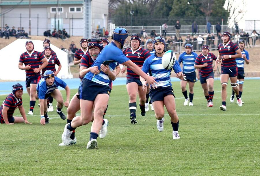 日本航空石川-北越 試合終了間際、ラストパスを受ける北越のSH宮迫正宗=花園ラグビー場