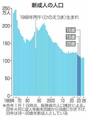 総務省が31日公表した2026年1月1日時点の人口推計によると、07年生まれの新成人(18歳)は109万人で、25年と並んだ。統計がある1968年以来最少だった24年の106万人に次ぎ2番目に少なく、少子化の流れが続いている。年男・年女に当たる午(うま)年生まれは940万人で、十二支別に見ると最も少ない。
