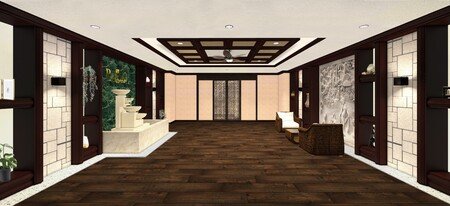 エントランスホールは、アジアンリゾートの優雅さを取り入れた上質な空間です。左手には水が柔らかく流れるウォーターオブジェを配置し、心を癒す落ち着いた空間を演出しています。右手にはバリ島の職人が手彫りで仕上げたストーンカービングを採用し、異国の工芸美が空間に深みをもたらします。木調のタイルと石材を基調としたデザインにより、ホテルラウンジのような落ち着きと温もりを実現します。