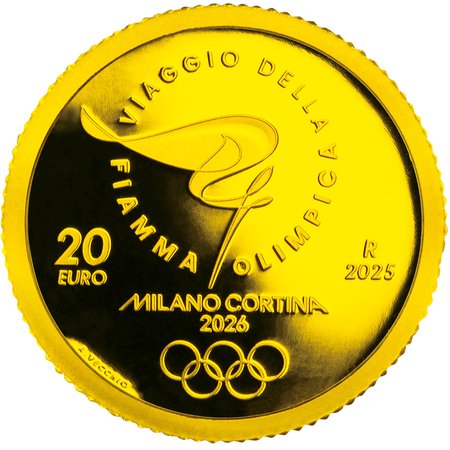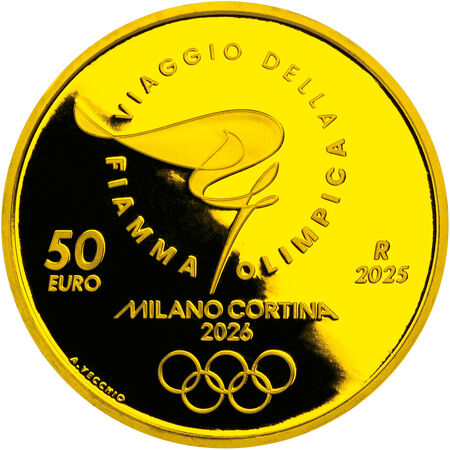 金貨は、重さ1オンス(約31g)と1/4オンス(約7.8g)の2種類。裏面には、オリンピックの情熱を象徴するトーチと聖火がゆらめく様子をシンプルで優美な曲線で表現した大会公式ルックや、その周囲にイタリア語で「オリンピック聖火の旅」と刻印。表面には、指でなぞるような一筆書き調で数字の「26」を表現した大会公式エンブレム「Futura(フーツラ)」を大きく描いています。