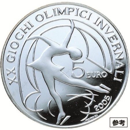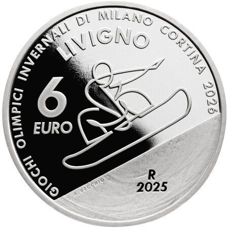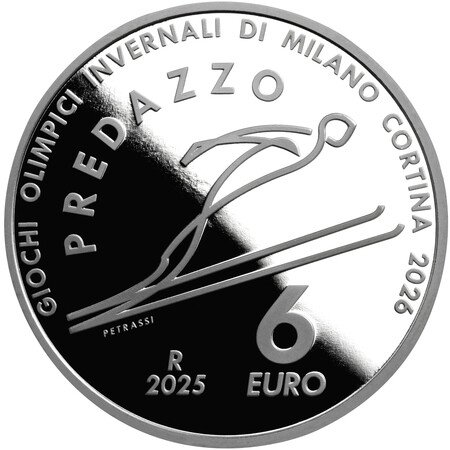 競技の公式ピクトグラムをデザイン。力強いジャンプから優雅に空中を飛翔する選手をシンプルな線のグラフィックで表現しています。上部をプルーフ(鏡面)、下部の氷の部分をマットに仕上げることでリアルさを演出しています。開催地(プレダッツォ)、大会名、額面も刻まれています。