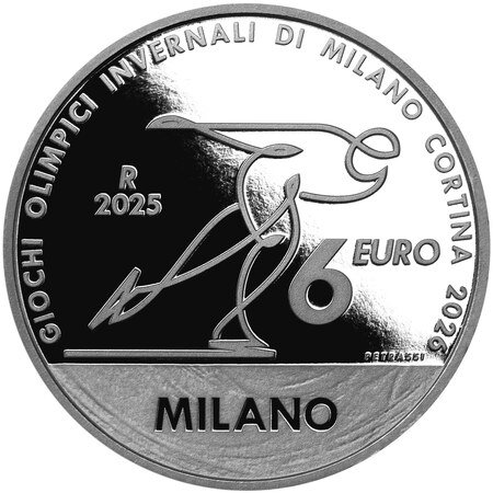 競技の公式ピクトグラムをデザイン。前傾しながら氷上を力強く滑走する選手をスタイリッシュなグラフィックで表現しています。上部をプルーフ(鏡面)、下部の氷の部分をマットに仕上げることでリアルさを演出しています。開催地(ミラノ)、大会名、額面も刻まれています。