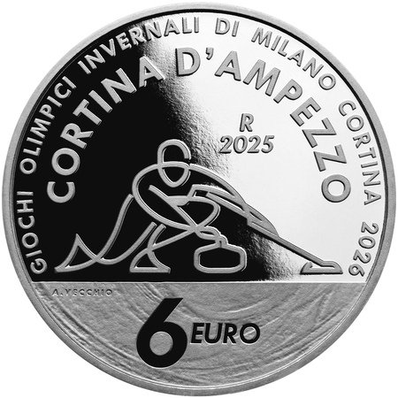 競技の公式ピクトグラムをデザイン。選手がストーンを投じる様子をスタイリッシュかつ躍動的なグラフィックで表現しています。上部をプルーフ(鏡面)、下部の氷の部分をマットに仕上げることでリアルさを演出しています。開催地(コルティナ・ダンペッツォ)、大会名、額面も刻まれています。