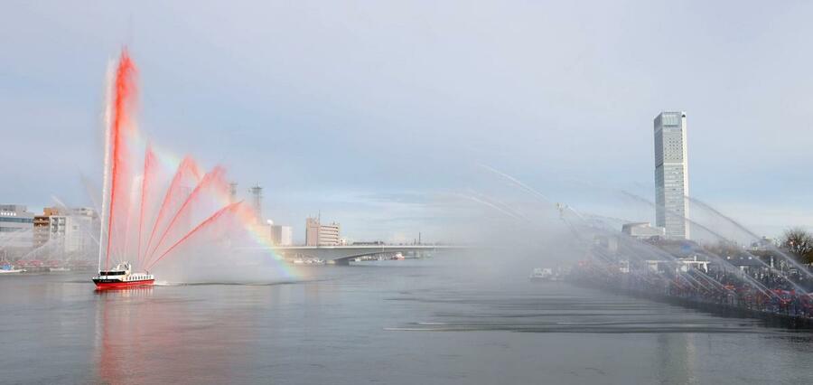 [昨年の様子]信濃川へ防災誓う「虹の放水アーチ」 新潟市消防局が出初め式、火事・災害のない1年願う