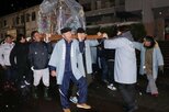 伸び伸びと動き回る佐渡地鶏ひげを世話する知本正廣さん=2025年12月、佐渡市八幡