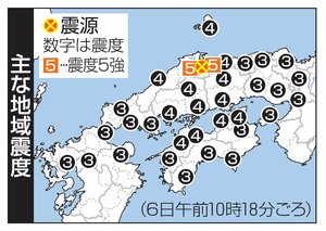 6日午前10時18分ごろ、鳥取県と島根県で震度5強の地震があった。気象庁によると、震源地は島根県東部で、震源の深さは約11キロ。地震の規模はマグニチュード(M)6・4と推定される。津波の心配はない。中国電力によると、松江市の島根原発で異常は確認されていない。政府は首相官邸の危機管理センターに官邸連絡室を設置した。