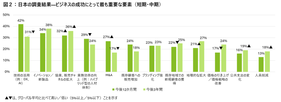 成長は経営者にとって依然として最大の追求目標です。しかし、そのあり方や源泉は変化しつつあります。日本では成長の原動力として、AIを含む技術の活用が短期で42%と最も高く(1位)、中期に31%(3位)に下がります。これは他国よりも顕著な変化です。一方で、イノベーション・新製品が短期の34%から中期に38%に増加し、成長ドライバーの1位となります。次いで協業・販売チャネル拡大による成長が短期の32%から中期は36%(2位)に増加し、短期・中期ともに他国よりも重要視されています。また、世界の経営者の回答も同様の傾向が示されており、技術の活用が42%(短期)から40%(中期)に下がり、順位も1位から2位に下がります。イノベーションや新製品は29%(短期)から42%(中期)に増加し、成長の主な原動力として1位になります。米国は、技術の活用が引き続き1位(短期:44%、中期: 47%)となり、割合が増え、かつ1位を維持する数少ない国の一つです。イノベーション・新製品は24%から38%(2位)に増加します。このように成長の原動力の構成は、国や地域によって多少なりとも違いがあります。全体的に日本は成長ドライバーが技術活用からイノベーション・新製品、協業・販売チャネル拡大と、外向けの展開へと短期から中期にシフトすることが特徴づけられます。