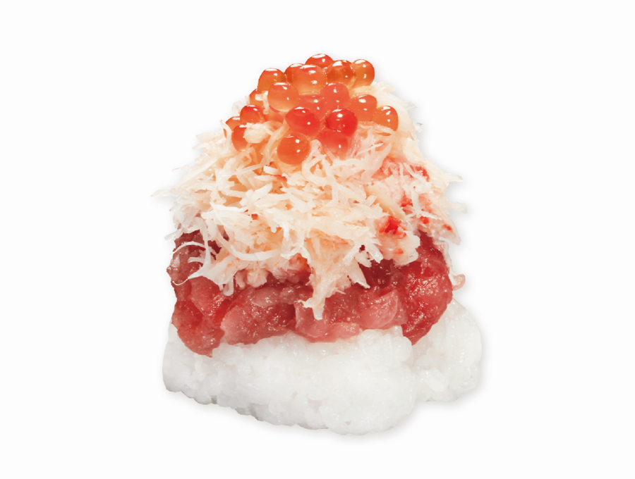 加えて、マグロの中トロ部分から特に脂乗りの良いものを厳選し熟成させた「熟成中とろ」は、上質な脂の旨みとマグロの旨みがバランス良く味わえます。また、新年にふさわしい赤富士をイメージした「まぐろカニマウンテン」は、華やかなでおめでたい一品で、縁起の良い紅白をマグロ、カニ、イクラをシャリに贅沢に盛りつけることで表現しました。