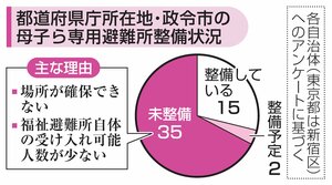 災害時に自治体が設置する福祉避難所のうち、妊産婦や乳幼児専用の避難所を整備しているのは、都道府県庁所在地など全国の主要52自治体の3割に当たる15市区にとどまることが、共同通信の調査で分かった。妊婦らには授乳や沐浴(もくよく)場所の確保など特別のニーズがあり、2024年の能登半島地震では石川県輪島市が専用避難所を1カ所設けた。地域事情によって開設が難しい自治体もあるとみられ、専門家は実情に応じた備えを求める。