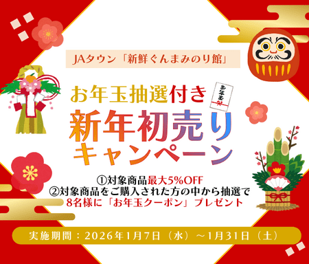 JA全農が運営する産地直送通販サイト「JAタウン」の群馬県のショップ「新鮮ぐんまみのり館」では、「お年玉抽選付き新年初売りキャンペーン」を開催します。