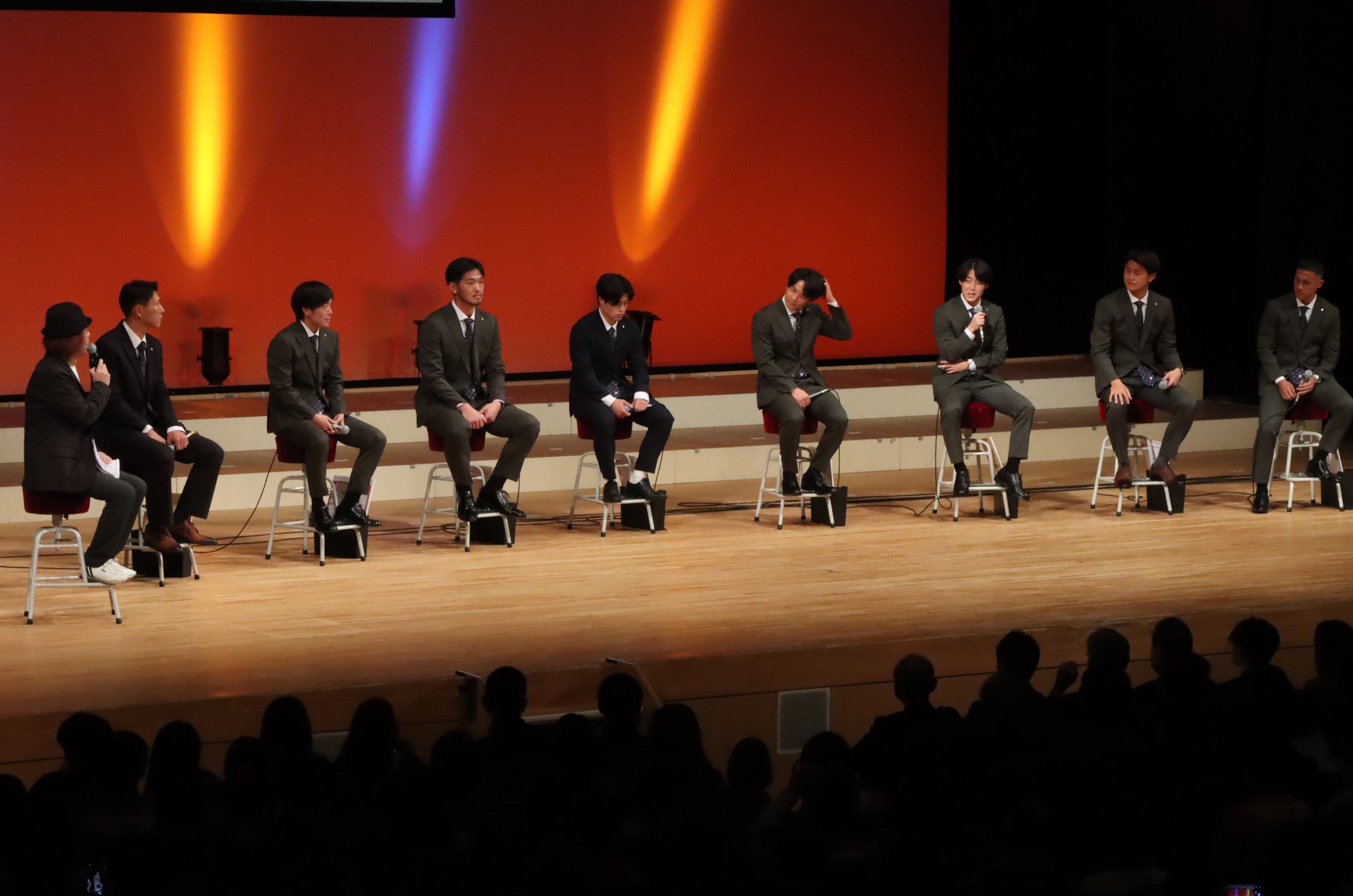 トークショーでは、お笑いタレントの平畠啓史さんがMCを務め、チーム合流前だったMF笠井佳祐選手、FWブーダ選手を除く31選手が4組に分かれ、登壇しました。