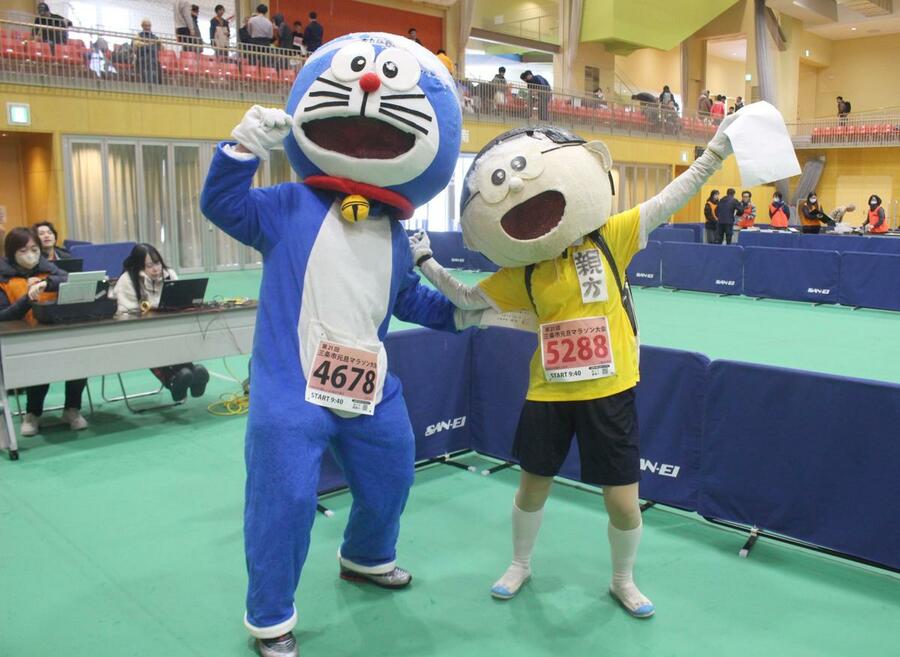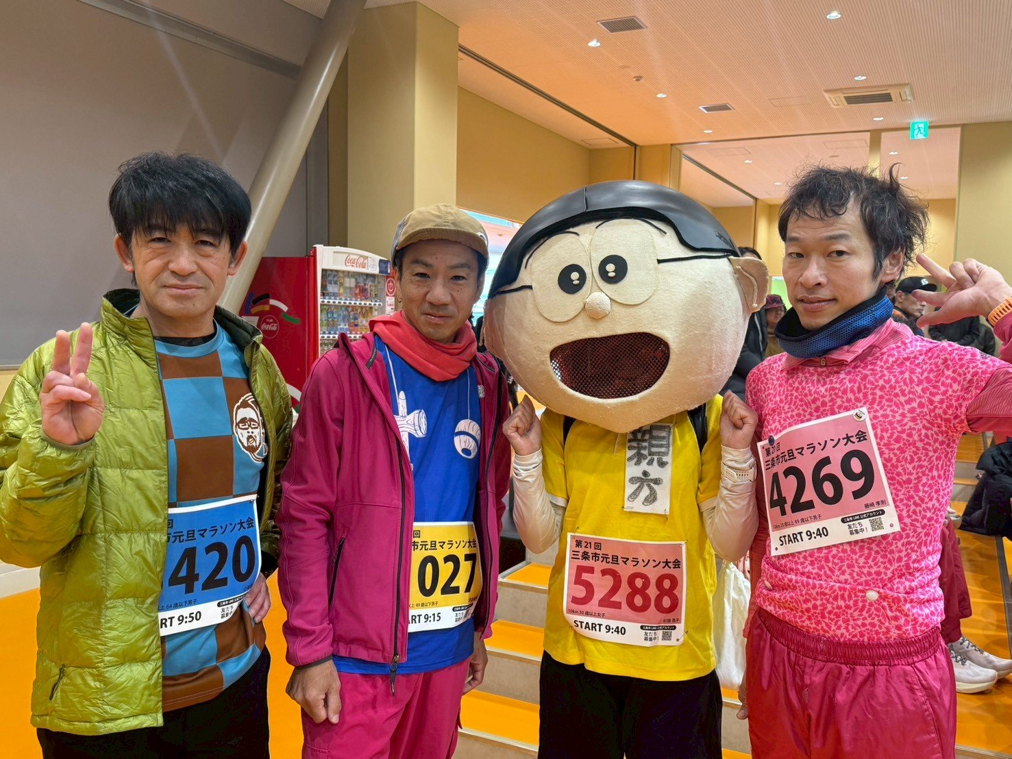 5年ほど前から元旦マラソンを走るという新潟市江南区の会社員男性(52)は5キロの部に出場。「ランナー仲間への新年のあいさつも兼ねています。毎年のルーティンですね」と話し、ドラえもんやのび太に扮(ふん)した仮装ランナーらと記念撮影していました。記録を狙うよりも大会そのものをイベント的に捉えて、楽しんでいました。