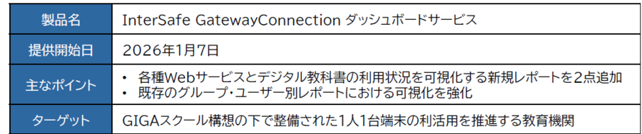 アルプス システム インテグレーション株式会社(本社:東京都大田区、代表取締役社長:金子 央、以下ALSI〔アルシー〕)は、クラウド型次世代Webフィルタリングサービス「InterSafe GatewayConnection(インターセーフ ゲートウェイコネクション)」の教育機関向けオプション「InterSafe GatewayConnection ダッシュボードサービス」において、Webサービス利用レポートなどを追加したアップデート版を2026年1月7日より提供開始いたします。