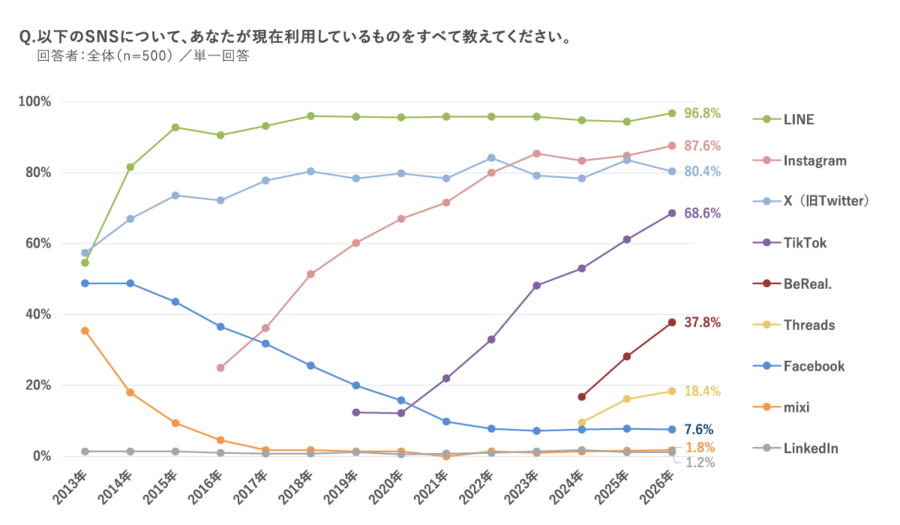 人気急増は「TikTok」利用率68.6%(6年で5.6倍)と、「BeReal.」利用率37.8%(2年で2倍)