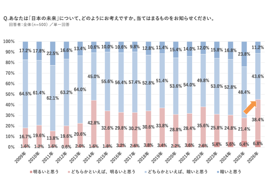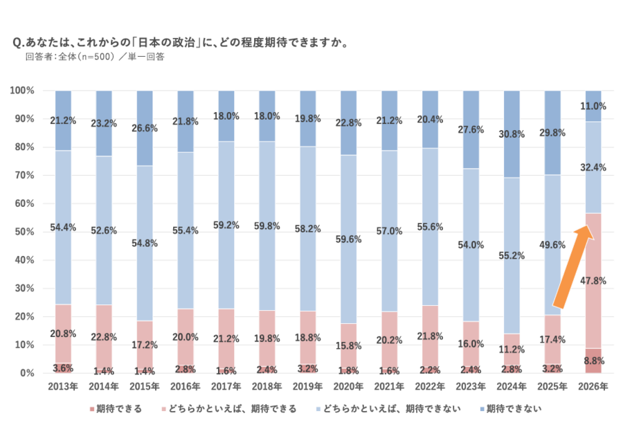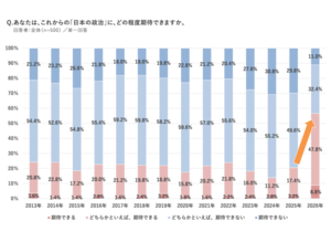 「日本の政治に期待できる」が56.6%で前年の2.7倍、「日本の未来は明るい」も45.2%で1.6倍に
