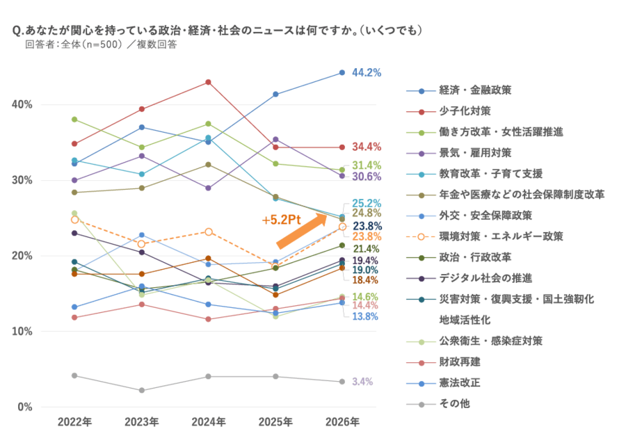 一方、前年からの上昇率で見ると、1位は「環境対策・エネルギー政策」で23.8%(同5.2ポイント増)でした。気候変動や緊迫する国際情勢によるエネルギー価格変動といった外部環境の変化が意識されていると推察されます。