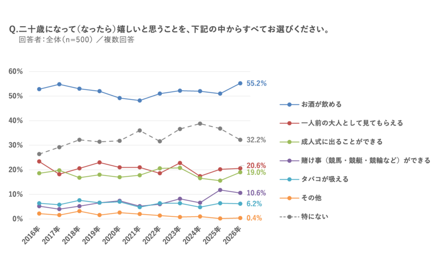 二十歳になって嬉しいこと、1位は「お酒が飲める」55.2%、過去10年で最高