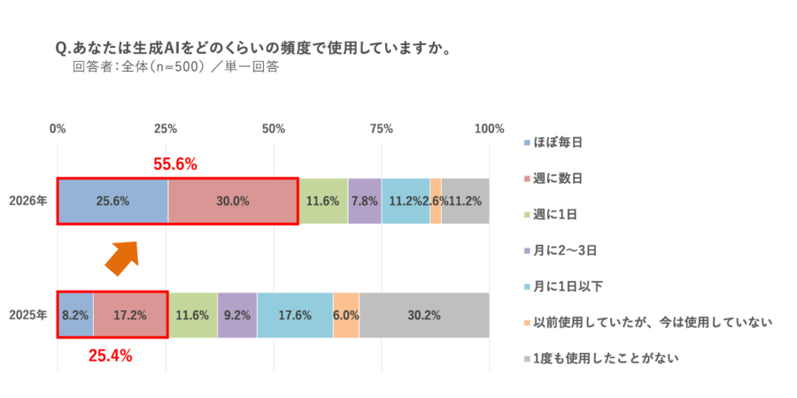 生成AIを「ほぼ毎日」利用する人は25.6%、「週に数日」は30.0%で、いずれも前年から大幅上昇しました。合計すると55.6%に達し、生成AIの活用が加速していることが分かります。