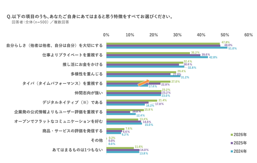価値観では、昨年に引き続き「自分らしさを大切にする」が47.8%で最多でした。上昇率を見ると、1位は「タイパを重視する」で27.0%(前年比4.2ポイント増)となり、2年で1.5倍になりました。
