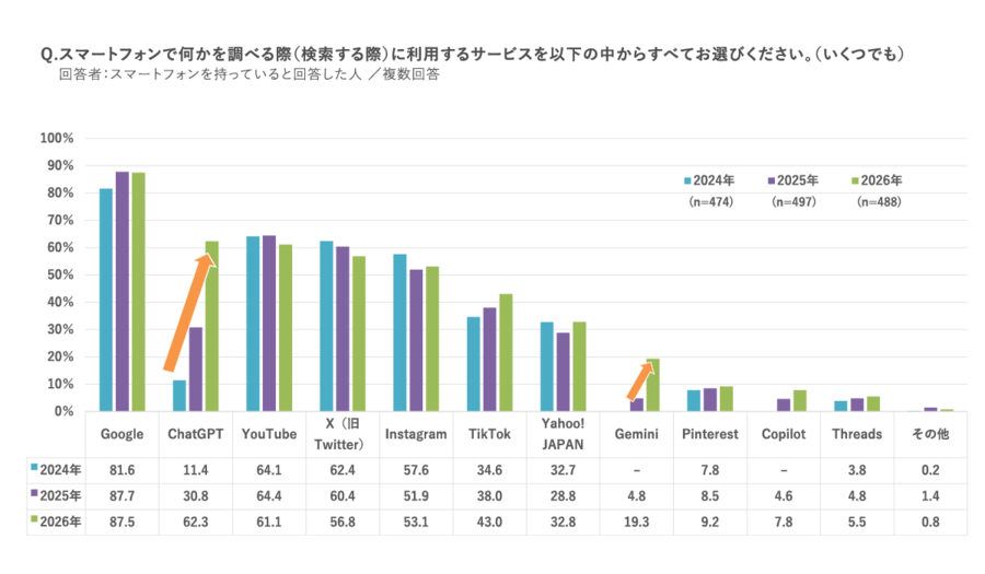 スマホ検索サービス、利用率1位は「Google」87.5%。2位「ChatGPT」62.3%。