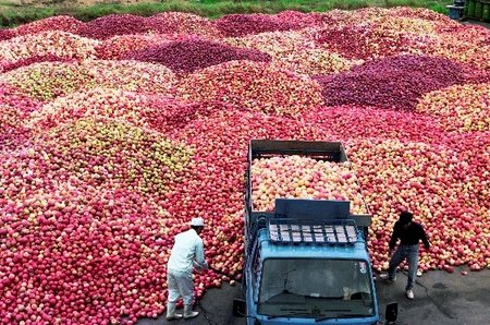 3. 青森県弘前市の加工工場に運び込まれた、台風で落下した大量のリンゴ(1991年10月)