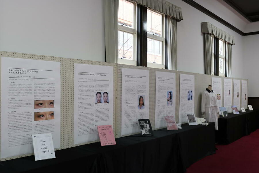 「卒業研究展示会」では、学生が制作したドレスをはじめ、ヘアやメイク、ネイルのディスプレイ、写真集、研究論文のパネルなど143点が一堂に並びます。さらに「卒業論文発表会」では、制作展で展示した自身の研究や作品の成果のプレゼンテーションが行われます。学生たちは、個性的な15研究室の教員指導の下、色彩、縫製、服飾史、心理学、美粧学、デザイン、ビジネス、身体社会学、化粧科学、環境問題など様々な研究成果を発表します。