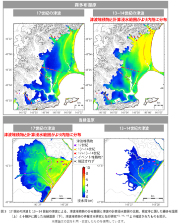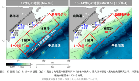 ・ 津波堆積物の調査および津波の浸水シミュレーションから、17世紀と13~14世紀に千島海溝南部で発生した2つの超巨大地震の震源特性を推定