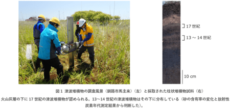 北海道太平洋沿岸では、先行研究により津波堆積物の分布が調べられています。本研究では、17世紀と13~14世紀の津波堆積物の分布状況の違いをさらに詳しく調べるため、浜中町霧多布の25地点、白糠町恋問の32地点、釧路市馬主来の3地点、大樹町当縁の28地点で掘削調査を行いました(図1)。堆積物中から津波堆積物を識別するために、地層中の火山灰層の分布、放射性炭素年代測定、堆積物中に含まれる砂の含有率の変化を調べ、先行研究との対比を行いました。この結果、浜中町の霧多布湿原では、先行研究が示した堆積物の分布限界より1 km程度内陸まで17世紀と13~14世紀の津波堆積物を確認することができました。