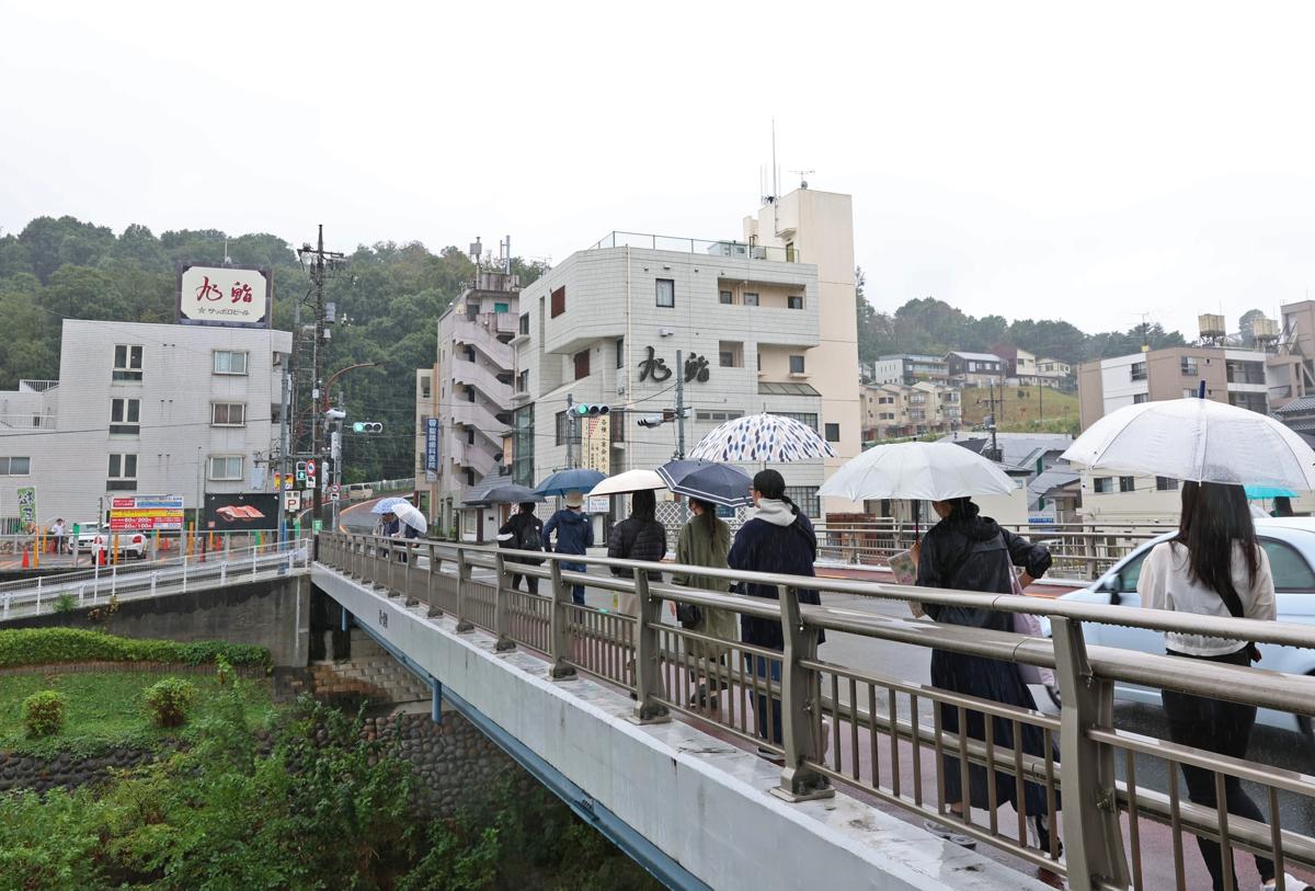 京王線の聖蹟桜ケ丘駅を出発し、主人公の月島雫(しずく)が行き来する坂道や、雫が通う骨董(こっとう)店があるロータリーを思わせる場所を約1時間かけて歩いた。小雨が降る天候にも関わらず、全国から集まった参加者は写真を撮るなど、作品の世界観を満喫した。