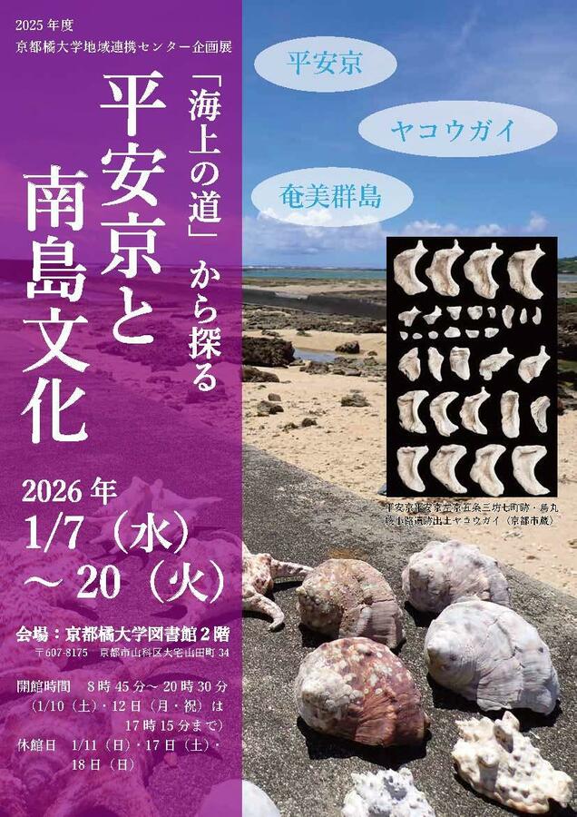 京都橘大学(京都市山科区、学長:岡田知弘) では、1月12日(月・祝)、本学文学部歴史遺産学科・准教授 南健太郎と共に、平安京研究の考古学者 山田邦和氏(同志社女子大学特任教授)と、夜光貝研究者 西野望氏(矢掛町教育委員会主幹学芸員)を講師に迎え、平安京と南島(奄美・沖縄地方)文化のつながりを考える講演会およびパネルディスカッションを開催します。