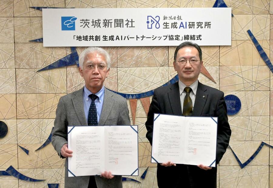 新潟日報生成AI研究所(新潟市中央区)と茨城県で日刊紙「茨城新聞」を発行する茨城新聞社(水戸市)は7日、両社が連携して生成AI(人工知能)の普及推進と地域活性化につながる新たな事業創出を目指す「地域共創 生成AIパートナーシップ協定」を締結したと発表した。