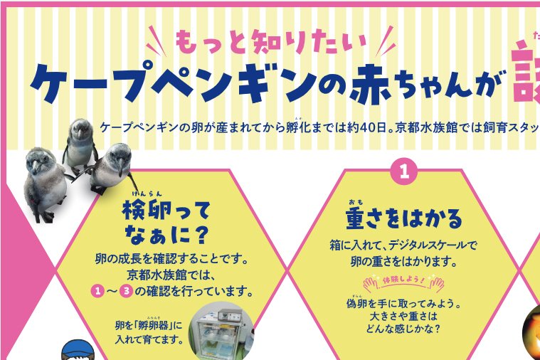 京都水族館では、ペンギンの卵が産まれると、ふ化の直前まで親鳥に代わり飼育スタッフが育てます。ふ化までの約40日間、毎日卵の成長を確認し、その記録を付けています。日々の成長確認では飼育スタッフがどのように工夫をしながら、どのような作業を行っているのかをまとめたパネル展示を行います。
