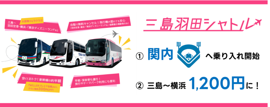 WILLER EXPRESS株式会社(本社:東京都江東区、代表取締役:平山幸司)、株式会社東海バス(本社:静岡県伊東市、代表取締役:田中直人)、伊豆箱根バス株式会社(本社:静岡県三島市、代表取締役:鬼頭研二)の3社は、静岡県三島エリアと羽田空港を結ぶ高速バス「三島~羽田線(愛称:三島羽田シャトル、URL:https://travel.willer.co.jp/bus/airport-bus/mishima-haneda/
