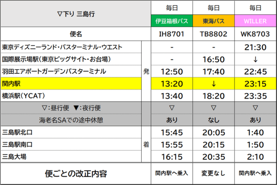 ・伊豆箱根バス・・・伊豆箱根バス株式会社、東海バス・・・株式会社東海バス、WILLER・・・WILLER EXPRESS株式会社