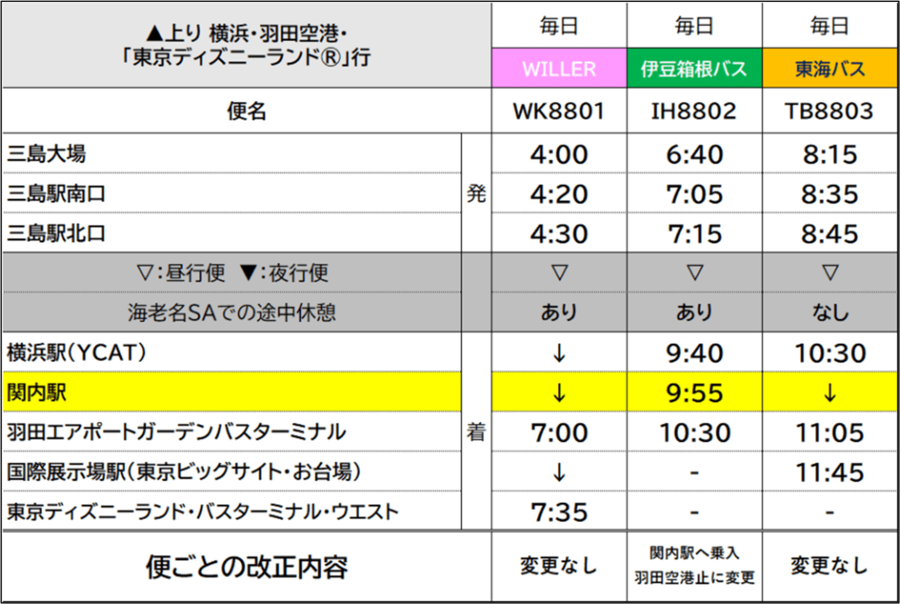 ・利用方法:「東京ディズニーランド®」・国際展示場駅・羽田空港・関内駅・横浜駅発⇒三島行の便を、予約サイト「WILLER TRAVEL」(https://travel.willer.co.jp/bus/airport-bus/mishima-haneda/