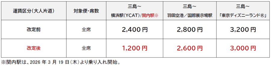 より多くの方に気軽に移動いただけるよう、三島・横浜市内間の運賃を従来の「基本プラン」の半額に変更します。また、羽田空港、国際展示場駅、東京ディズニーランド®発着の運賃は従来の「予約割引プラン」と同額に値下げします。三島にお住まいの方は「横浜が身近な遊び場として」、首都圏にお住まいの方は「三島をリフレッシュ先として」それぞれの暮らしに寄り添う快適な移動を提供します。