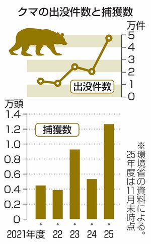 環境省は7日までに、2025年4〜11月のクマの出没件数が全国で4万7038件(速報値)に上ったと発表した。記録が確認できる09年度以降、最多だった23年度の2万4348件を大きく上回り過去最多となっている。公表していない北海道、生息していないとされる九州、沖縄は除いた。捕獲数(北海道を含む)は計1万2659頭(速報値)で、記録が確認できる06年度以降、23年度の9276頭を超え、過去最多。