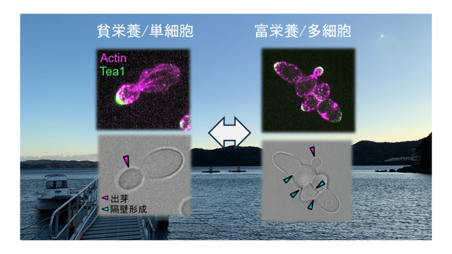 本研究は、海洋由来酵母種が栄養に応じて単細胞性と多細胞性を切り換えることを発見し、遺伝子操作技術の確立を通じて切り換えに必要な遺伝子経路を解明した重要な成果です。地球の生命史の大きな転換点の一つとされる多細胞生物の進化の機構への理解が深まることが期待されます。