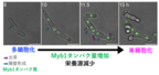 さらに、機能未知の転写因子注5)Myb1がこの切り換えを制御する極めて重要な遺伝子であることを発見しました。Myb1を細胞から除去させた酵母は単細胞化する能力を失い巨大な多細胞になる一方、Myb1を過剰発現させた酵母は常に単細胞として増殖しました。ライブイメージングの結果、Myb1は貧栄養下では発現量が上昇する一方、栄養を与えるとプロテアソーム注6)依存的に急速に分解されることが判明しました。つまり、Myb1の細胞内タンパク質量は環境中の栄養源の増減と密接に連動して変化しており、これが栄養源依存的な単細胞/多細胞の転換を生み出すスイッチの分子実態であることが解明されました(図2)。