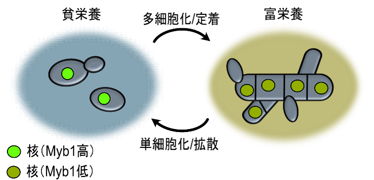 ・単細胞増殖している酵母に栄養を与えると、細胞内のMyb1タンパク質が急速に分解され、多細胞体の成長モードへと転換した。逆に、Myb1の発現は単細胞化を誘導した。Myb1が単細胞性―多細胞性変換の分子スイッチであることが示唆された。