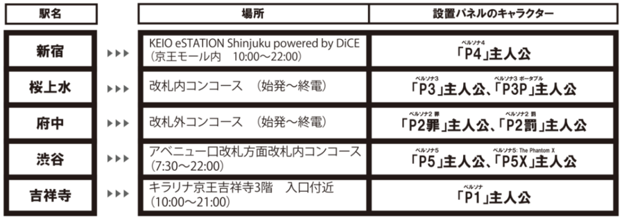ペルソナシリーズの各主人公の等身大キャラクターパネルが設置されている京王線新宿駅や井の頭線渋谷駅など全5カ所ラリースポットを巡り、LINE公式アカウントからスタンプラリーにアクセスし、二次元コードを読み込むことでデジタルスタンプを集めるスタンプラリーを開催します。