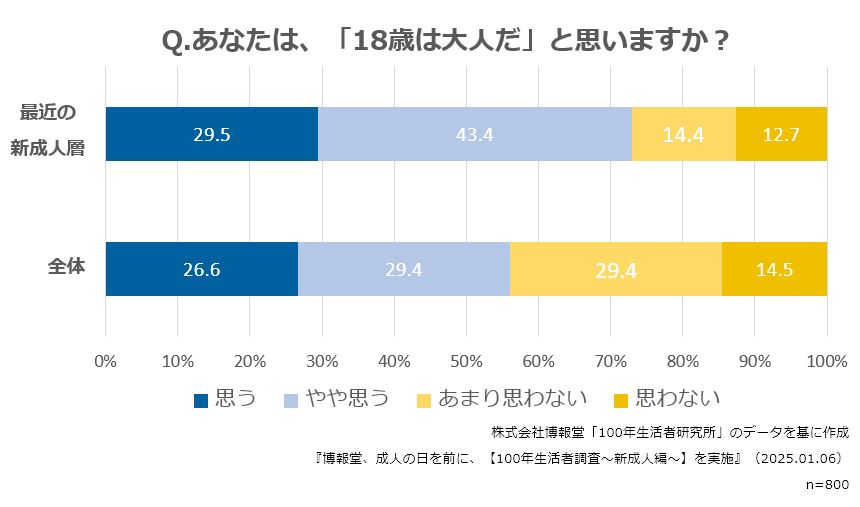 日本では2022年より18歳が成人として定められました。しかしながら、自治体等が主催する成人式は20歳を対象にすることが多く、18歳が成人であることを意識する機会が限られています。また、株式会社博報堂「100年生活者研究所」が2025年1月に18歳~80代以上(800名)を対象に実施したアンケートでは、18~20歳の最近の新成人層の72.9%が「18歳は大人だ」と思う反面、全体では半数近くの43.9%が「18歳は大人だと思わない」と回答しています。