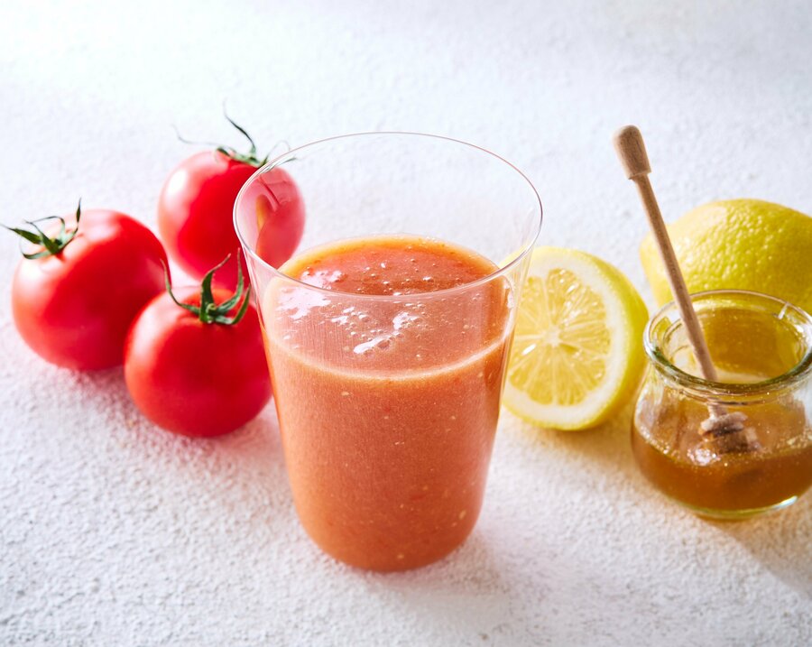 トマトはカゴメ「高リコピントマト」を使用。自社でトマトレモンジャムを作り味わいに深みを加え、レモンピール入りで、後味も香りもすっきり。はちみつでほんのり甘く仕上げ、トマトが苦手な方にも飲みやすい味わい。寒い日には温めて、やさしい甘さと香りを楽しめます。※トマトのうち、高リコピントマト74%使用